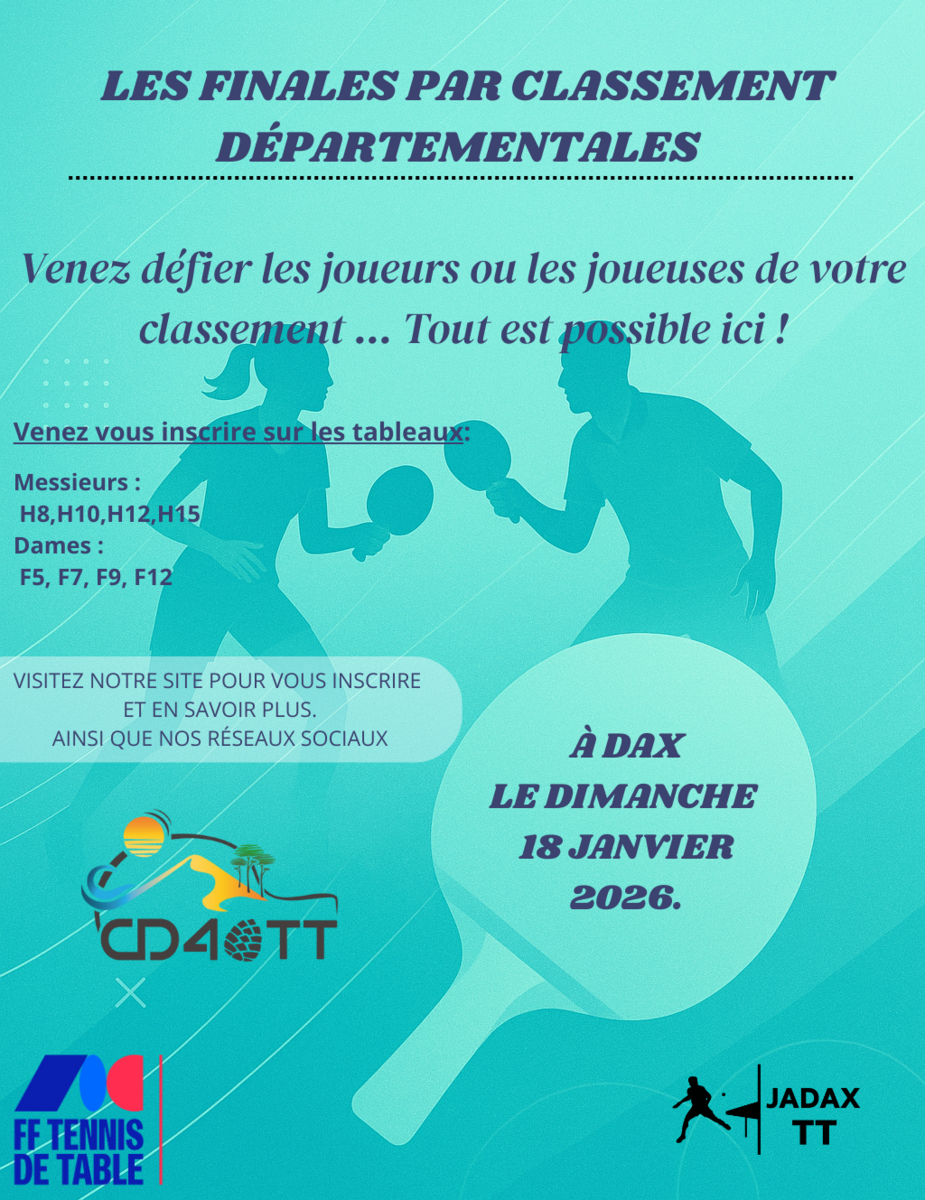 L'échelon départemental des FINALES PAR CLASSEMENTS aura lieu le dimanche 18 Janvier 2026 à Dax. L'épreuve est qualificative pour le niveau Territorial Sud qui aura lieu à Terrasson le 04 Avril 2026. La formule ne change pas, 8 tableaux sont proposés suivant le classement :